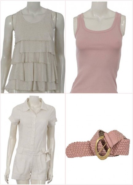 Blusa bege Izola, blusa regata Maria Moda, macaquinho bege Maria Moda, cinto Izola.